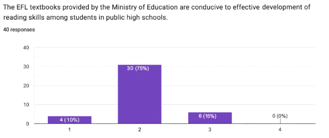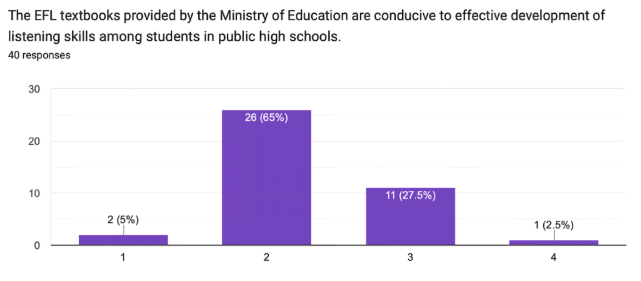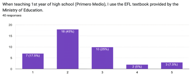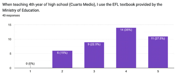 In the final open-ended questions of the survey, in which teachers were given an opportunity to share more in-depth opinions, several teachers expressed that the EFL textbooks provided by the Ministry of Education for the last two years of high school were not interactive, interesting, and aligned with national standards for teaching EFL. Other teachers mention that the textbook for the last year of high school is not relevant enough for high school students since it does not cater to the correct level of students from the region. These comments shed some light on potential reasons for the high percentage of teachers who do not use textbooks during their senior year of high school.