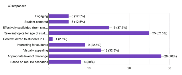 The final section of the survey invited participants to select pedagogical terms they associated with the nature and design of the EFL textbooks provided by the Ministry of Education. This section is intended to gain a more detailed understanding of teachers' perceptions and opinions of the textbooks from their perspective as EFL teachers. Figure 10 presents the pedagogical terms or characteristics teachers believe are reflected in the textbooks. The pedagogical characteristic that most teachers (70%) associated with the textbooks is the appropriateness of the level of challenge of the student activities and exercises, which seems to indicate that the design of the textbooks is well scaffolded and has a good understanding of what students are capable of doing in each of the four years of high school. The survey also revealed that 62.5% of respondents revealed that textbooks often have topics relevant to teenagers in high schools. Besides these two aforementioned pedagogical traits, only two other ones were selected by teachers with an acceptance rate of over 30%: visually appealing (32.5%) and effectively scaffolded (37.5%).