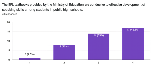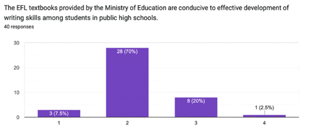 The survey results clearly reflect that the EFL textbooks provided by the Ministry of Education are strongly perceived by teachers as much more appropriate for teaching and supporting students as they develop listening, reading, and writing skills. The substandard perception of teachers towards the usefulness of the textbooks for guiding students as they develop speaking skills may be due to a lack of meaningful and realistic speaking tasks, as indicated by some respondents in the open-ended questions. It is also worth mentioning that in order to develop speaking skills, much more class and practice time is required for students, and most public high schools do not offer more than three or four hours of English lessons per week.