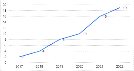 Un análisis cuantitativo de los resultados muestra que durante el periodo de análisis de 2017 a 2022 ha existido un aumento de las publicaciones totales sobre discurso del odio incluidas en la Web of Science y en las bases de datos de tesis doctorales ya mencionadas. La figura 1 muestra que los números totales de publicaciones sobre el tema (59 investigaciones: 57 artículos y 2 tesis doctorales) presentan un aumento mayor al 200 % cada dos años, es decir, cada año se publican más del doble de documentos que dos años atrás. En 2017 se publicaron solo 2 trabajos, pero este número se duplicó en 2018 y llegó a 4 publicaciones. Luego, en 2019, hubo un aumento más notable, con 8 publicaciones, lo que indica un mayor interés en el tema. Este comportamiento continuó en 2020, con un total de 10 publicaciones, lo que sugiere que el tema comenzó a ganar más atención en la comunidad académica internacional de ciencias de la información y la documentación. El año 2021 marcó un salto significativo en la cantidad de publicaciones, con 16 trabajos, lo que indica un fuerte aumento en la investigación, y, en 2022, el número de publicaciones continuó aumentando a 19 trabajos, lo que refuerza la idea de que el tema sigue siendo relevante y constituye un área de interés activa para los investigadores.