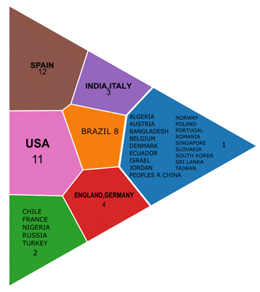Los países más productivos en términos de publicaciones, tal como se representa proporcionalmente en la figura 2 de forma gráfica, son España, con 12 publicaciones, seguido de Estados Unidos, con 11 publicaciones, Brasil, con 8 publicaciones, Inglaterra y Alemania, con 4 publicaciones cada uno, e India e Italia, con 3 publicaciones cada uno. En cuanto al análisis por regiones geográficas agregadas, Europa es el continente con la mayor representación en la producción científica sobre el discurso de odio, con países como España, Inglaterra, Alemania e Italia aportando múltiples publicaciones. Aquí debe señalarse la relación especial de estos países con el discurso del odio, de manera histórica, como Alemania; de manera histórica y bajo amenaza continua, como España; de manera histórica y bajo gobierno en el momento de escribir este artículo, como Italia, y en relación con el Brexit y su parafernalia de noticias falsas y xenofobia, como Inglaterra. América también muestra una presencia considerable, con Estados Unidos y Brasil como países líderes en investigación sobre el tema (ambos habiendo sufrido gobiernos de extrema derecha en los últimos años). Asia y África también han realizado contribuciones en menor medida, con India, Turquía y Nigeria representando el interés en estas regiones. En general, la investigación sobre el discurso de odio muestra una distribución global, con diferentes regiones del mundo mostrando interés y preocupación por esta problemática en internet y muchas de ellas afectadas o bajo amenaza de los gobiernos y grupos productores de noticias falsas y discurso del odio.