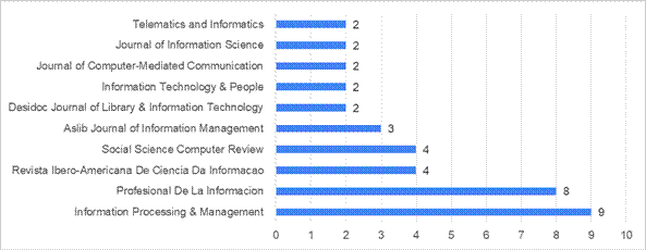 Las revistas científicas son un medio fundamental para la difusión de investigaciones y hallazgos en diversos campos del conocimiento, y el caso del discurso de odio no es una excepción. La figura 3 muestra las revistas científicas más prolíficas como canales de divulgación de investigaciones sobre discurso del odio en las ciencias de la información y la documentación.