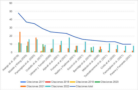 Según Szomszor et al. (2020), las citas recibidas de una publicación pueden ser un indicador de su importancia, utilidad o impacto de la publicación. La figura 5 reúne los artículos más citados de la lista que abordan diversos aspectos de la detección, prevención y confrontación de discursos de odio en línea. Esto sugiere un interés continuo y creciente en la investigación sobre este tema y su impacto en la sociedad y las comunidades en línea.
