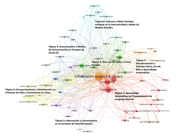 El análisis de coocurrencia de palabras clave con VOSviewer constituyó una herramienta útil para identificar no solo las temáticas con mayor frecuencia presentes en los trabajos recuperados, sino también las tendencias de investigación en el campo del discurso de odio. VOSviewer es un software de visualización y análisis de datos bibliométricos que permite identificar patrones de coocurrencia de palabras clave en la literatura científica.