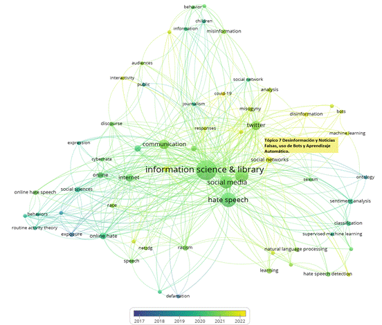 Para obtener los tópicos emergentes (figura 8) fue utilizada la overlay visualization de VOSviewer para las temáticas de investigación que se encuadran en el período de análisis (2017-2022). El tópico 7, identificado por el color amarillo (más reciente) en la visualización, representa el cluster emergente en el campo de investigación sobre discurso del odio. La clasificación como emergente sugiere que este cluster ha ganado relevancia y ha experimentado un aumento en la producción de trabajos recientemente (2021-2022). Los trabajos relacionados con el tópico 7 pueden entonces considerarse como tendencias emergentes en el campo del discurso del odio y sugieren que han ganado prominencia debido a eventos recientes y actuales en la sociedad que han destacado la importancia de abordar dichos aspectos del discurso del odio desde nuestra área. Los investigadores de este tópico están explorando y analizando aspectos específicos que antes no habían sido objeto de una atención significativa, como es la desinformación y noticias falsas, uso de bots y aprendizaje automático como aspecto metodológico para su abordaje y detección.