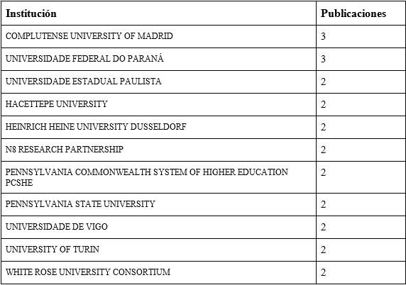 En relación con la producción científica a nivel de instituciones, en la tabla 1 se muestran ordenadas por frecuencia de publicaciones las más productivas y destacadas en el ámbito de la temática del discurso de odio. Estas instituciones corresponden con las afiliaciones de los autores de las contribuciones e investigaciones sobre el tema y, de alguna forma, podrían reflejar el apoyo o tolerancia institucional.