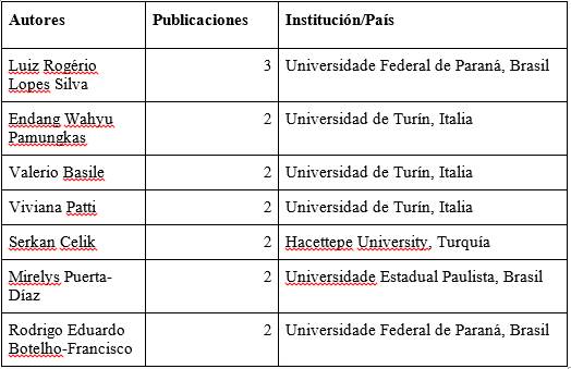 Del total de 159 autores, 152 presentan apenas una publicación sobre el tema en el período analizado, mientras que existe un grupo de 7 que presentan dos o más publicaciones entre tesis y artículos científicos: Lopes Silva, Pamungkas, Basile, Patti, Celik, Puerta-Díaz y Botelho-Francisco. Estos autores representan apenas el 4 % del total de 159 autores identificados en la recuperación de datos. El conjunto de investigadores restantes que contabilizan apenas una publicación en el periodo de análisis se refiere a aquellas indexadas por la Web of Science, lo que no quita que existan otras publicaciones no indexadas, que tendrían un menor impacto o visibilidad. La tabla 2 presenta este grupo de siete autores más productivos e incluye algunos elementos contextuales, como su institución y país.