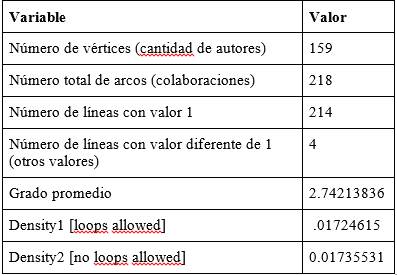 Existen 214 conexiones directas entre autores en la red que representan dichas colaboraciones de coautoría. Cada línea con valor 1 indica una colaboración entre dos autores específicos, lo que sugiere que han trabajado juntos en una publicación conjunta. En particular, el número de líneas con valor diferente de 1 (otros valores) es de 4, lo que sugiere que algunos pares de autores han colaborado en más de una publicación conjunta.