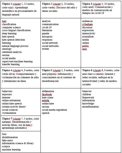 Algunos puntos destacados de los datos de esta imagen son los siguientes: la palabra clave más frecuente es «hate speech», destacada en color rojo, que ocurre 29 veces en los documentos analizados, lo cual es un dato esperado ya que es el tema troncal de los documentos recuperados; otras palabras clave frecuentes incluyen «information science & library science» (52), el área de la ciencia donde se encuadra el presente estudio, «social media» (22), «computer science» (22) y «communication» (12). Se puede observar un conjunto de temáticas que son estudiadas desde diferentes áreas y por diferentes comunidades epistémicas, aún siendo publicadas por revistas centradas en el área de ciencias de la información y la documentación, y por tanto el énfasis en el área es considerado un aspecto importante para ser resaltado por los autores. En la tabla 4 se incluye la relación de tópicos y clusters de palabras clave extraídas de los documentos.