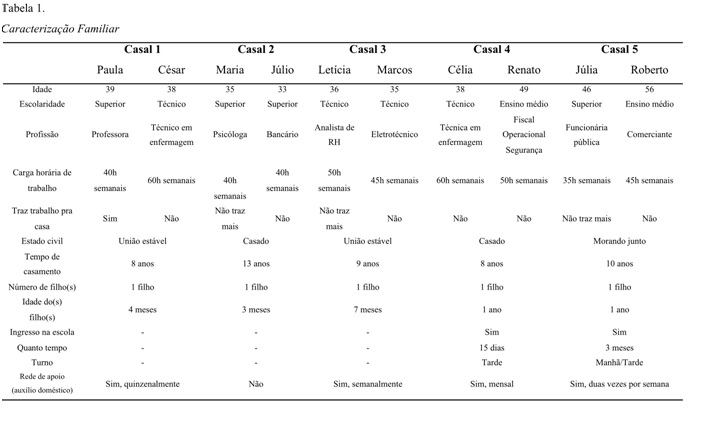 Como mostrado na tabela 1, os participantes apresentaram idades entre 33 a 56 anos, com carga horária de trabalho a partir de 35 horas semanais. Com relação a escolaridade dos casais, dois concluíram o ensino médio, quatro possuem ensino técnico e quatro, graduação. Em relação ao estado civil, apenas um casal não está em união estável ou casado, apenas morando junto. Dos cinco casais participantes, três deles as mães encontravam-se em licença maternidade, e consequentemente as crianças estavam sob seus cuidados. Os outros dois casais, as crianças já frequentavam a escola.