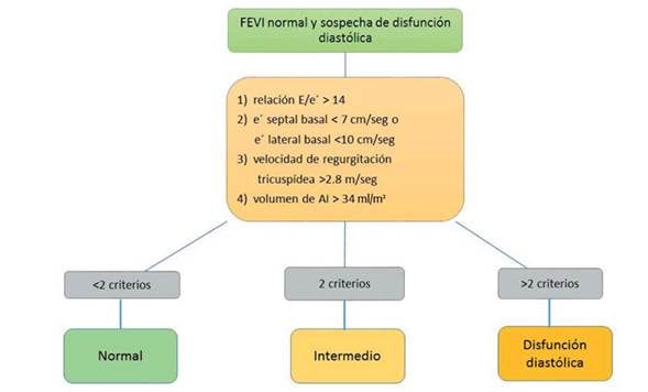 Figura 1: Criterios ecocardiográficos para definir función diastólica en pacientes con insuficiencia cardíaca con FEVI preservada.
