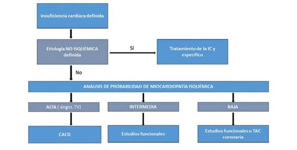 Figura 2: Algoritmo diagnóstico para valoración de etiología isquémica en la insuficiencia cardíaca. IC: insuficiencia cardíaca; CACG: cineangiocoronariografía; TV: taquicardia ventricular; TAC: tomografía axial computarizada.