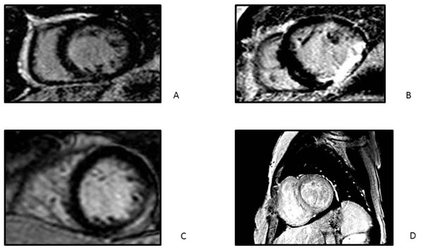 Figura 3: Patrones de realce tardío en búsqueda etiológica. A: normal. B: tipo isquémico (subendocárdico o transmural); C: tipo no isquémico (paciente con miocarditis); D: patrón de realce tardío endocárdico global (paciente con amiloidosis cardíaca).