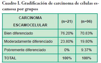 En la distribución de acuerdo al diagnóstico histológico y gradificación por grupos, tenemos que en el primer grupo de los 21 casos de CCECB 16 fueron bien diferenciados, 5 moderadamente diferenciados y no se reportaron pobremente diferenciados. En el segundo grupo de los 96 casos de CCECB 68 fueron bien diferenciados, 19 moderadamente diferenciados y 9 pobremente diferenciados.