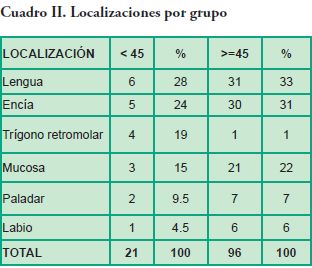 Con respecto a la localización, en el primer grupo la más frecuente fue el borde lateral de lengua con 6 casos, seguido de encía con 5, trígono retromolar con 4, mucosa con 3, paladar con 2 y labio con un solo caso. En el segundo grupo la localización más frecuente fue el borde lateral de lengua con 31 casos, seguido de encía con 30, mucosa con 21, paladar con 7, labio con 6 y trígono retro molar con 1 caso.