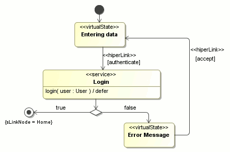 In addition to the navigational tree diagram ( figure 1), the role diagram (figure 3), and the zone diagram (figure 4), we can show another node diagram in figure 10. This figure models the login process in which the user has to type a user name and a password (“Entering data” virtualState), then a login service is executed to validate data, and finally, depending on the results, an error message will appear (“Error Message” virtualState), or a soft link will take the user to the “home” node of the system.