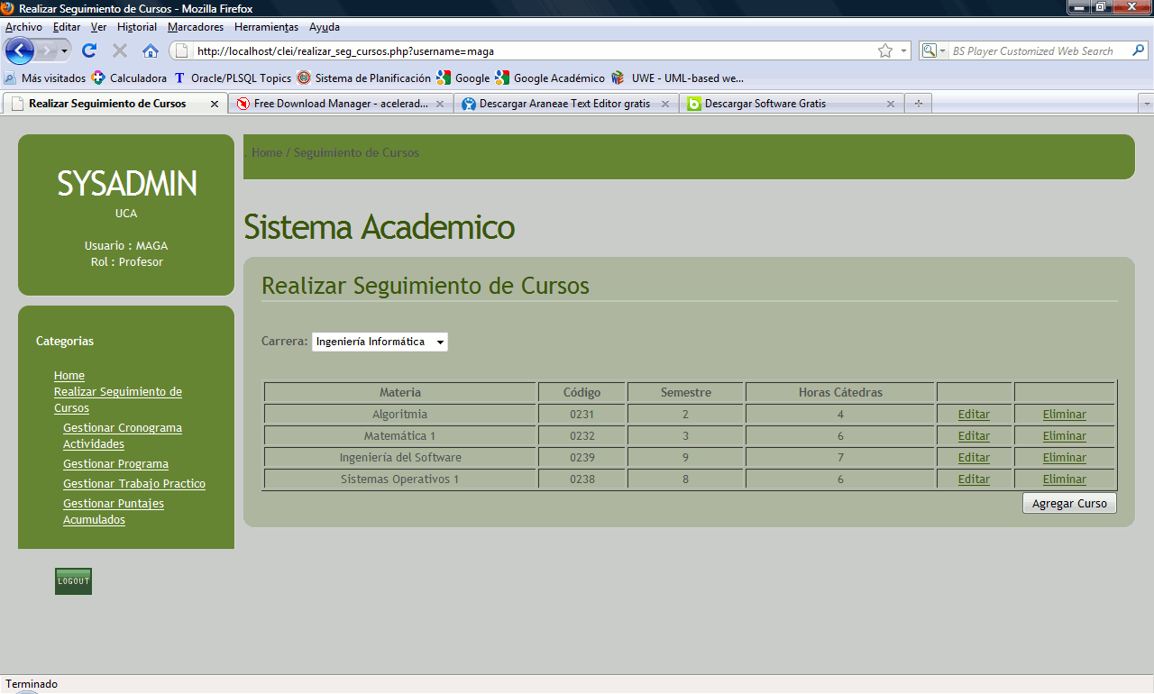 The roles or zones association to navigational nodes can be visualized in the navigational tree ( Figure 1). In this figure, it is possible to observe that some nodes do not have access privileges (i.e., can be accessed by any user), as is the case of the root node "Home". The node "Perform tracking of courses" assigns access privileges to the zone "Academic" (this zone contains the roles "Student" and "Professor" and depends on the domain class "Subject"). This indicates that both the node "Perform tracking of courses" as those which are below of it have access privileges of such a zone. The role each user assumes will depend on the courses he selects. Finally, the node "Faculty Management" assigns access privileges to the zone “Administration”. However, the child node "Career Management" assigns access privileges to "Academic Secretary”, indicating that it may be viewed and accessed by one of the roles played in the "Administration", and such access is restricted to the nodes children ("Enroll Students" and "Courses Management").