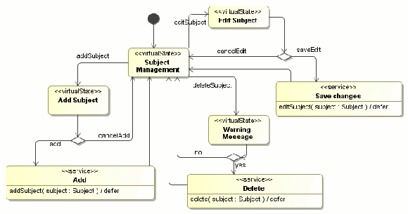 The node diagram allows modeling aspects related to navigation behavior obtained from dynamic interactions with the user. Figure 2 shows a diagram example for the navigational node "Subjects Management". This figure first shows the virtual state "Subject Management" which will display all existing subjects for a particular career. The user has the possibility to add a new subject, delete or edit an existing one.