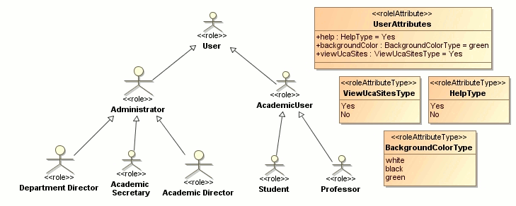 The Role Diagram represents the hierarchy of user roles. To set this diagram notation we propose the use of the actor’s hierarchy provided by UML in which, in addition, each actor may have a number of attributes in order to model personalization aspects. These attributes are called "personalized attributes" (examples of attributes are customizable language, style pages, colors, grants, etc.). Figure 3 shows an example of a role diagram.