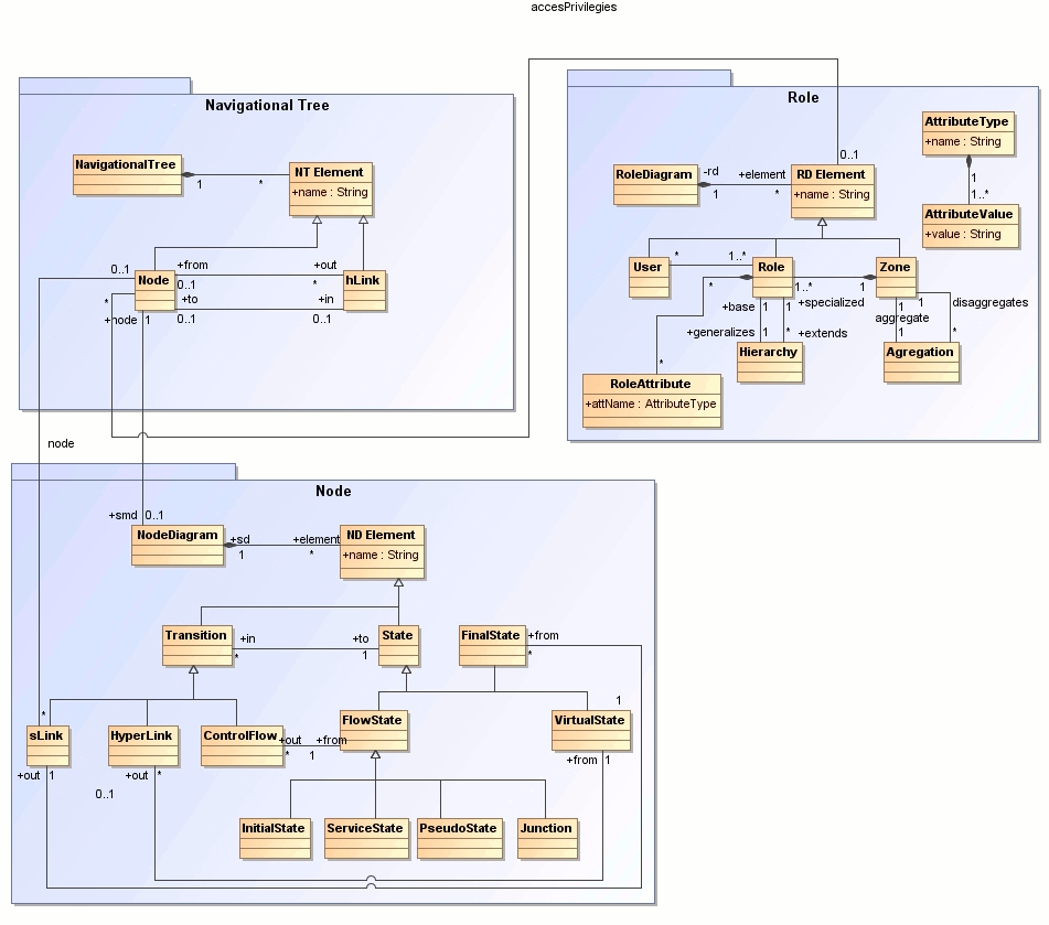 Finally, we can mention the different relations between the three metamodels. The node element in the Navigational Tree has an association with NodeDiagram (node metamodel) meaning that for each node there exist at most one NodeDiagram. Node also has an association with sLink (node metamodel) since it is possible to assign a soft link transition to any node of the tree as a final state of a node diagram. The association between node (navigational tree metamodel) and RD Element (role metamodel) indicates the level of accessibility of each node of the tree (zone, role or user).