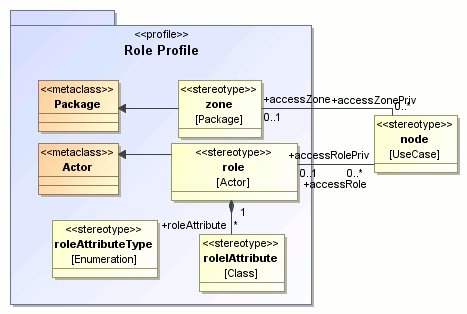 The zone diagram, use the UML packages notation with the stereotype <<zone>>. Each package contains the available roles in that zone and a possible dependency relationship with a domain class. Then, whenever defining the accessibility level on the Navigational Tree diagram is necessary, we can specify a zone or a particular role for any navigational node. Finally, if instead of associating a zone to a node, we associated it to a particular role, the access node would be limited by the specified role.