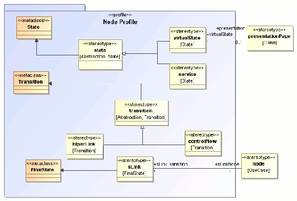 Each tree node must have an associated Navigational Node Diagram representing the internal navigation of it. The node diagram is defined using the UML State Diagram. In this sense, the node diagram consists of two types of elements, states and transitions. There are three categories of states: Flow states, Virtual states and Final states. Flow states are transient and so are crossed momentarily to create linkages with other elements of the model. Among these we have four types: 1) the initial states, 2) pseudo states, such as choice, 3) junctions, 4) and finally the service states that models the services provided by the node. Virtual states, represent stationary states indicating the fact that the model remains in a "virtual point" within a node and should be linked to a presentation page.