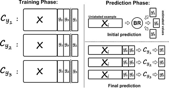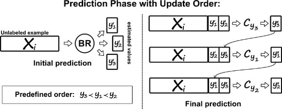 The classification of a new example could be carried out in a similar way to the standard BR approach using these augmented binary classifiers. However, as each one of these classifiers has been generated using a feature space which is different to the original one, the unlabeled examples must also consider this augmented feature space. In other words, the feature space of the unlabeled examples must be augmented accordingly to the training set that generated the corresponding classifier.