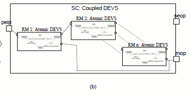 The specification of the ConnectionMechanism concept (DEVS) follows the same principles written for the simple component, obtaining the CM coupled model (Fig. 5 (b)). So, the relationships between the connection mechanism and their responsibilities can be specified as a relationship of hierarchy, where the instances of RM that represent the responsibilities are components of CM.