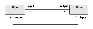 This pattern proposes two types of elements: components called Filters and connectors called Pipes. A pipe passes the information flow from a filter to another filter, while the filter converts this information to obtain a new flow adapted to the requirements of the system. A filter can be connected to any number of input pipes and to any number of output pipes (Fig. 8).