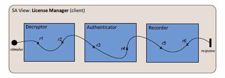 This model represents architectural elements of the system adding functional aspects to them, considering not only quality requirements but functional requirements. The responsibilities have causal relationships. Stimulus begins an execution flow obtaining a result as response.