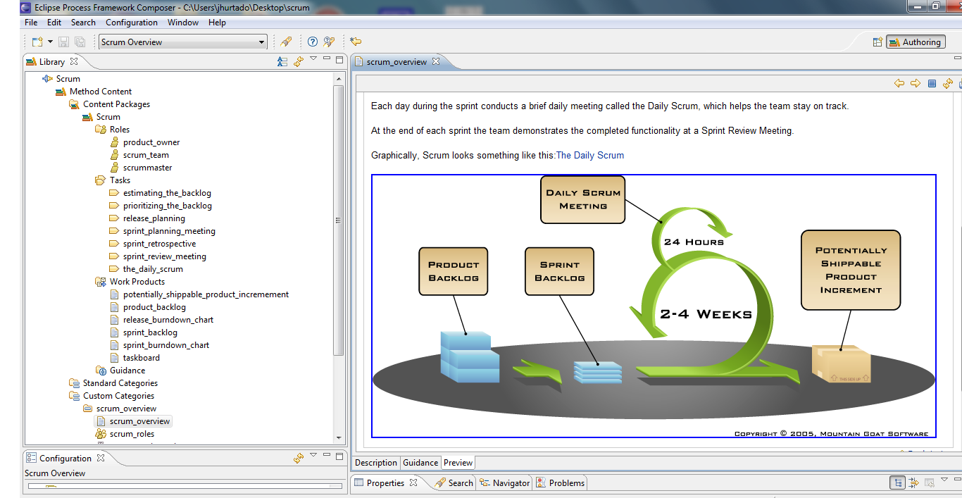The Scrum process model presented by the Eclipse Process Framework Community has been defined as a SPEM 2.0 method plug using Eclipse Process Framework. This definition includes roles, work products and tasks, and a set of guidance, and is organized only in method packages and categories as shown in Figure 3. The process structure has not been defined because Scrum is inherently incomplete as a process and it is considered as a process framework more than a complete process itself. As a consequence, the EPF community has defined Scrum life cycle as a Supporting Material element (a specific Guidance) where it is graphically and textually described. Although, this definition does not include all the phases defined in [12], the Scrum life cycle could be defined and customized in a Delivery Process by each organization adopting the Scrum plug-in. The method package elements have been defined and linked according to a Scrum description as was presented above. However, the question that still remains is if the method elements will match this or other adapted life cycle. For example, are the tasks outputs and inputs consistent among the tasks within a value flow? These are relevant questions mainly when the model is used for the first time, or for comparing or combining it with other process models.
