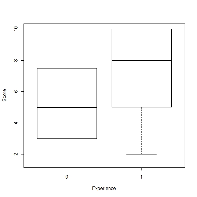 Based on the descriptive analysis of the scores according to the experience factor (Table 9 and Figure 2) we have evidence that the mean score may differ for the two levels of the factor. The second analysis of variance showed that the mean score was significantly different (Table 10). The hypothesis that previous programming experience does not produce an increase in score was rejected, i.e., students with previous experience obtained a highest score compared to those without previous experience. Considering the interaction between the factors, it was possible to conclude that their relationship is not significant. The influence of the group factor was also considered significant to the increase of score in this analysis.