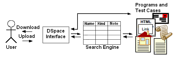 A schema for the proposed repository is shown in Figure 4. The complete deployment and configuration of DSpace is planned as a future work. The repository is configured to store test case sets and the associated reference programs, considering topics taught in introductory programming disciplines. The repository is organized to enable user interaction, so that it does not act merely as a storage compartment; users can add new learning objects and, for each download done, they should provide feedback about the use of the downloaded object. The teacher can look for materials in the repository using a sort key, as for example the name of the program. The information initially available in the repository are related to the discipline of Introduction to Computer Science, such as: program structures: decision and repetition statements, primitive data type, modularization of programs, procedures, functions and parameter passing; compound data types: vectors, matrices, strings, records, dynamic structures (pointers and files). When the user selects a particular topic, the system will retrieve all the programs registered in the repository that are related to the chosen topic. Selecting a program, the user obtains the following information: program specification, programming language, courses where it can be used, level of difficulty and estimated time for implementing the exercise. Information about the test case sets related to the program selected are also avaliable, such as: testing criteria used, number of test cases, the test cases (input and output data) and coverage obtained.