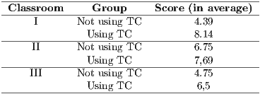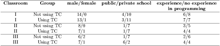 Table 5 shows the data extracted from the questionnaires filled by students, which were also considered in the analysis of the results. For each classroom and group (not using TC and using TC) it is presented the quantity of males and females, the number of students from public and private school, and, finally, the number of students with previous experience in computer programming and students without previous experience. In the following, these results are statistically analyzed and discussed.