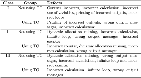 Table 4 presents the main defects found in the programs generated by the students. Most of them are related to defects in programming logic and in the design of the solutions.