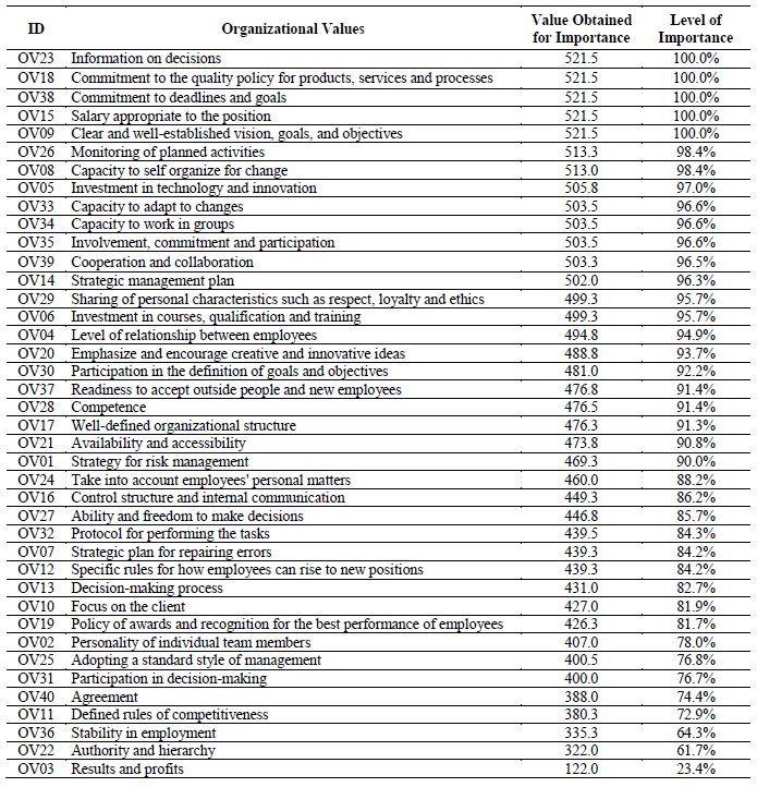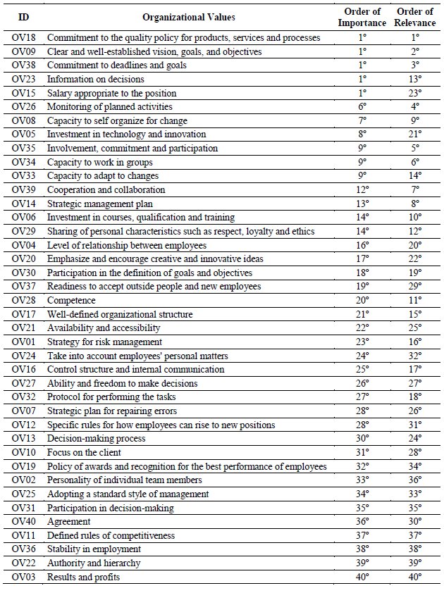 We can observe in the results that the OV obtained different classification considering their importance and relevance analysis. Table 10 provides a comparison between the order of importance x relevance for each organizational value.