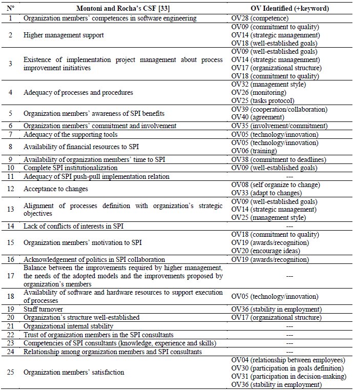 Montoni and Rocha (33) investigated CSF that affect the implementation of SPI initiatives applying qualitative and quantitative methods of data analysis. Table 11 presents a comparison between the CSF from Montoni and Rocha (33) to the OV identified in our proposed systematic literature review.