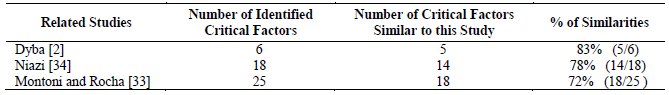 Analyzing the critical factors identified by Niazi (34), we can see that 14 of them, about 78%, were similar to the OV identified by this research, as shown in Table 12. In this case, 21 values were used for obtaining the similarities, and 67% (14 of them) are among the 20 more relevant according to order of relevance.