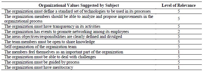 Analyzing which OV would be more relevant to support the implementation/evaluation to SPI initiatives, according to the subject’s opinion, the main values would be for the top managers: (i) having a commitment to the quality policy for products, services and processes, (ii) establishing a vision, goals, and objectives clear and well-established, and (iii) monitoring of planned activities. In addition, the team members must have responsibilities with deadlines and goals for the project and have an involvement, commitment and participation in the final result. This last organizational value, according to the subjects’ opinions, is one the most relevant to the implementation/evaluation to SPI initiatives (with 87.6%) and one of the most important for charactering and achieving success in a software organization (96.6%). For the eleven new OV suggested by the subjects, a level of relevance was also indicated, as presented in Table 9.
