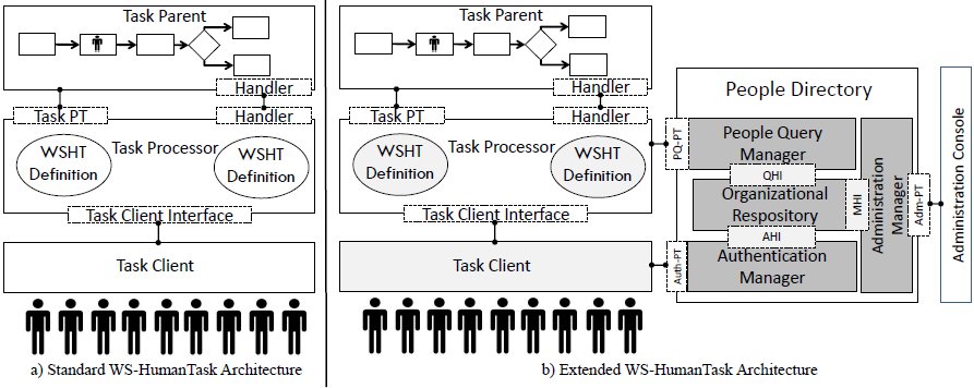The following paragraphs introduce the architecture specified by WS-HumanTask in order to manage the life cycle of tasks that need to be performed by people. This architecture is depicted in Figure 4a).