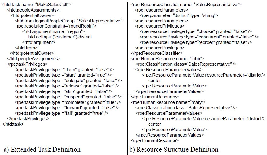 In a previous work (8), the Resource Perspective was characterized in terms of three aspects: Resource Structure, Work Distribution and Authorization. An extension to the BPMN 2.0 metamodel and notation (9) was developed in order to enable the definition and visualization of these aspects in process models defined by using BPMN. In a later work (10), a mapping of these extended BPMN models into the syntax elements provided by BPEL4People and WS-HumanTask was also proposed.