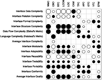 As shown in Table 5, the resulting OO metrics are correlated with at least two WSDL metrics, and the signs of the correlations within one metric are always opposite, with the exception of the CBO metric. Therefore, some metrics represent trade-off opportunities. For example, the CAM metric is negatively related to Interface Structure Complexity, but positively related to Interface Data Complexity. Then, by incrementing the CAM metric, resulting WSDL documents will present a better value for Interface Structure Complexity metric than the original WSDL document. However, this will cause a deterioration of Interface Data Complexity metric, since the latter and CAM statistically grow together.
