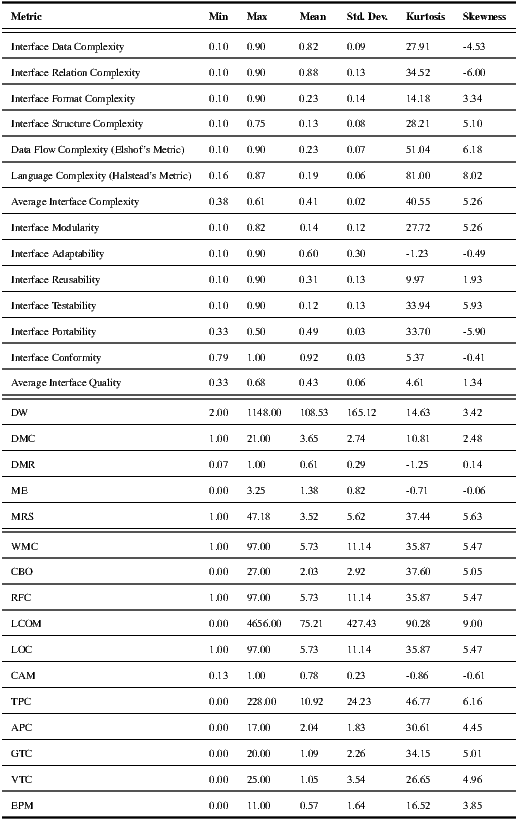 On the other hand, the dependent variables were the metrics at the WSDL-level, i.e., those proposed in (3) and (8). Table 2 statistically describes both independent and dependent variables. As shown in Std. Dev. column all dependent variables values were concentrated around the central tendency (i.e., Mean column), while this phenomenon persisted for independent variables values with some exceptions namely LCOM, WMC, and TPC. The Skewness column characterizes the location for metrics values distribution, in particular these results showed that most distributions are skewed to the right since their means were higher than their median. Furthermore, the skewness of three metrics was very near to 0, which is the skewness of the Normal distribution. The Kurtosis column shows that most metrics values did not tend to have a flat top near the mean rather than a distinct peak near the mean, decline rather rapidly, and have heavy tails. These results and the correlation analysis were obtained by using Apache’s Commons Math library(Apache’s Commons Math library, http://commons.apache.org/math).