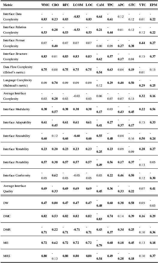 By analyzing the correlation between OO and Sneed’s WSDL metrics, it can be seen that the values of two WSDL metrics can be computed based on the values of a different sub-set of WSDL metrics. Average Interface Complexity is the average value of complexity metrics, and Average Interface Quality is the average value of quality metrics. Then, these two metrics may be removed by basing on the fact that their statistical relationships are represented by base metrics. Furthermore, if we want to keep only highest correlated pairs of variables, the correlation factors below