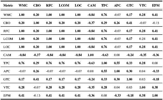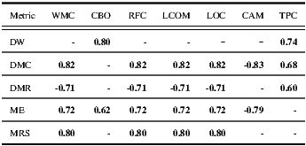 at the 5% level can be removed. Then, the OO metrics APC, GTC, and VTC can be removed. Then, from Table 3, a new 4x7 table (see Table 5) can be obtained, which represents a minimalist sub-set of correlated metrics.