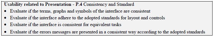 - Usability related to Presentation Perspective: relates to how consistent the information is presented to the user. Under this perspective, the usability is satisfactory if the arrangement of the interface elements allow the user to accomplish his/her tasks effectively, efficiently, and pleasantly.