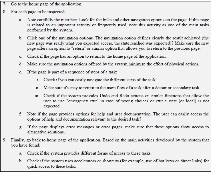 - Usability related to Navigation Perspective: relates to different user’s access to the system functionalities. Under this perspective, the usability is satisfactory if the navigation options allow the user to accomplish his/her tasks effectively, efficiently, and pleasantly.