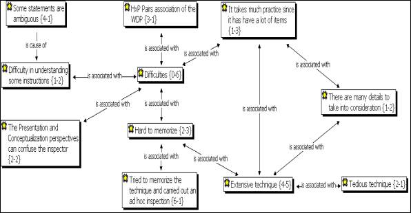 The codes “Difficulty in understanding some instructions” and “The Presentation and Conceptualization perspectives can confuse the inspector” points to problems of understanding the technique. This is probably because the similarity between some instructions (code “Some statements are ambiguous”), cited by four inspectors. In addition to the examples given in the survey, it was possible to verify the discrepancies reported in the spreadsheet in which some were associated to more than one statement, which may be an indication of ambiguity among the instructions.