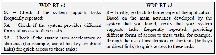 In order to increase the coverage of the WDP-RT evaluation, beyond the set of items used in the WDP verification, we analyzed two sets of features to be considered in usability evaluations, the “non-functional usability requirements” (6), and the set of “functional usability features” (14).