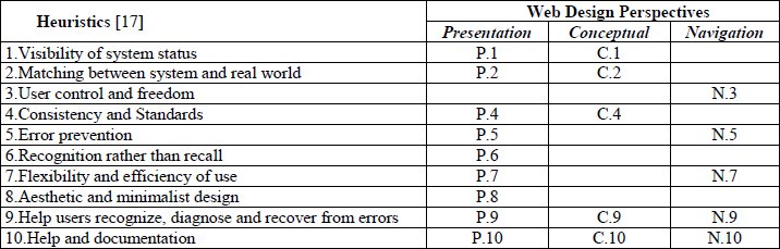 Table 1: Relationships between Heuristics and Design Perspectives in WDP Technique